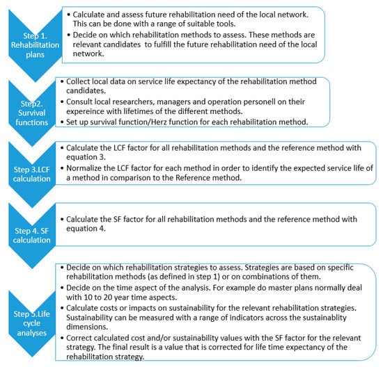 The implementation of the sustainability factor makes it possible to compare rehabilitation methods and strategies irrelevant of their expected lifetimes and service life distributions, which leads to a more fair comparison of their long-term sustainability performance. Although the work by Stokes and Horvath [] focuses solely on energy use and emissions, they conclude that such an analysis without the life cycle concept in mind can significantly underestimate the sustainability impacts. We try to base our procedure on the same reason of thought. That is why the overall objective of the paper is to link the strategic asset management approach with the sustainability concept of life cycles.