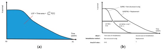 Based on a study of past Norwegian rehabilitation projects, literature study about pipe deterioration in Norway and the theory supporting the combination of survival functions (see discussion in the introduction of Section 3) for coordination projects, survival functions could be defined for each rehabilitation approach (numbers 1–6) based on Norwegian conditions []. These survival functions can be described by the, b and c values of the Herz function, see Section 3 and Table 2. Equations (1)–(4) were then used to calculate the individual LCF and SF values, which are presented in Table 2.