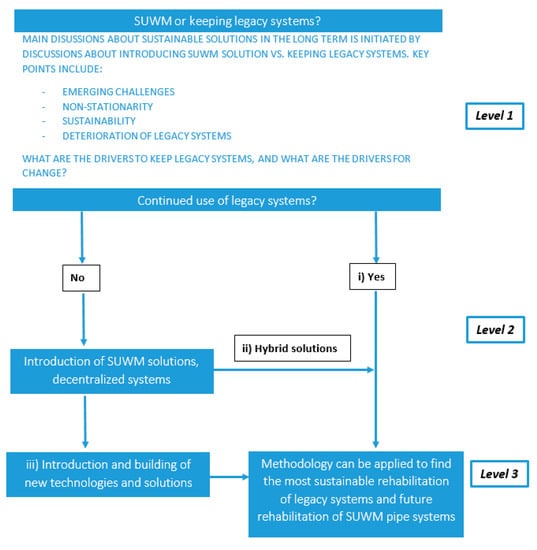 When a utility is planning strategic level measures, it is natural that they should start by assessing different solutions based on area specific needs. Every area of a city has their own challenges and their own needs and should be assessed individually with regards to their specific metrics. Based on the metrics, the challenges and the needs, a solution is suggested based on either (i) continuing maintaining legacy systems; (ii) partly implementing SUWM technologies through a hybridization process; or (iii) completely rebuilding the area system with SUWM principles and technologies. This process is illustrated with Figure 4, which illustrates the steps of the long-term decision-making process for implementing sustainable solutions. Discussions about the most sustainable solutions for a water utility should, therefore, be taken at level 1 in the figure, where discussions about long-term technological solutions, approaches, and principles are initiated. The most sustainable path should be decided locally based on geography, population, social state, economy, state of existing network, local challenges, etc. Discussions about the continued use of legacy systems or introduction of SUWM principles should be initiated and decided at this level.