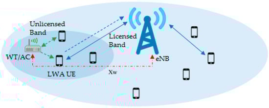 We consider a scenario with eNB and APs, enabling many UEs to fall under the coverage of both LTE and WLAN APs, as shown in Figure 1. An eNB is connected to the MNO-operated Q APs, usually called wireless terminal (WT)/access controllers (ACs), by a high-speed backhaul link, which is common practice in the present day. M UEs equipped with both LTE and WLAN transceivers (smartphones) and another set of N UEs supported with WLAN-only transceivers (laptops/tablets) are uniformly distributed under the coverage of both LTE and a WLAN network. As mentioned in TS Report 36.300 [], the eNB holds all the necessary statistics of all MNO-operated APs and UEs under the APs in its database. The M UEs under the coverage of both standards will have three options: option 1, WLAN-only; option 2, LTE-only; and option 3, LWA. Options 1 and 2 are the default connections available on the market. Option 3 will be added for LWA service. Moreover, each UE is restricted from using more than one communications mode. Whenever the LTE UEs’ attachments are modified to accommodate option 3, they will be reported to the eNB. Note that we consider a case where, even if UEs choose option 3 mode, there is no guarantee they will be served by LWA. However, they will be listed as LWA-preferred UEs in the eNB hardware, and later approved in the eNB by our proposed algorithm. Following 3GPP release 13, LWA supports downlink transmission for WLANs and both uplink and downlink transmission for LTE.
