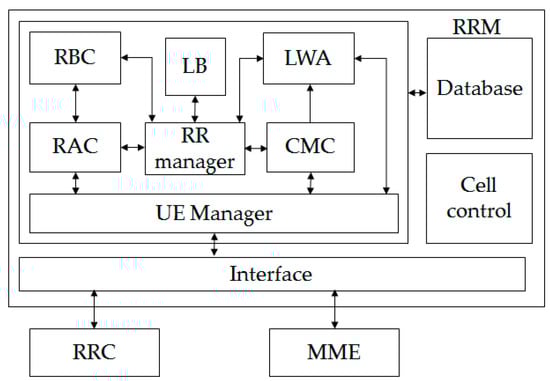 We consider the LWA architecture shown in Figure 2 using radio resource management (RRM), for which details were provided by Lin et al. []. The RRM entity in eNB is responsible for admitting or rejecting new UE requests for practicing LWA procedure. RRM functionalities can be divided into four different parts, i.e., database, interface, cell control, and UE control. The RRM database stores UE records such as current state, bearer configurations, ongoing procedure, LWA related configuration information from Aps, and WLAN measurement reports. The interface entity allows interaction between radio resource control (RRC) and mobility management entity (MME) layers. The cell control helps to control cellular configurations for interference and broadcasting messages. The UE control section controls UE admission. In this UE control section, the LWA entity has been introduced to handle the WLAN measurement reports and to control the downlink data path by executing LWA activation, deactivation, and mobility. There is a load balancing (LB) entity which mitigates uneven distribution of the traffic load over LTE and WLAN. Similarly, the radio admission control (RAC) entity interacts with the RRM (responsible for LTE and WLAN radio resource management) to decide whether new radio bearers should be established according to available resources in LTE/WLAN and their QoS requirements. The radio bearer control (RBC) establishes the data radio bearers (DRBs) based on their radio bearer configurations after they are admitted by the RAC. Our algorithm resides on the LB entity which executes whenever a new bearer is created by RAC and distributes the data through the LTE and WLAN by modifying radio bearers at the RBC entity. There is an additional connection mobility control (CMC) entity which helps for mobility management and handover between the APs.