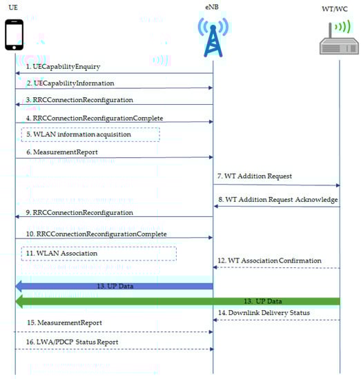 When UEs initiate LWA service requests by selecting option 3 (i.e., LWA mode), the eNB requires UEs to perform WLAN measurement in order to receive information on WLAN radio conditions (i.e., a WLAN connection status report). The UEs perform WLAN measurement to detect the status of the connected WLAN AP. The WLAN measurement report is comprised of the received signal strength indicator (RSSI), the WLAN identifier, WLAN carrier information, channel utilization, a station count, the admission capacity, the WLAN rate, the backhaul rate, and information about UEs connected to the WLAN. Based on the WLAN measurement report (a RRC report) on the RRM database, the eNB executes the UEs’ selection algorithm residing on a LB entity for LWA activation or deactivation by configuring the bearer at the RRM layer. The detailed algorithm run by eNB is shown in Figure 3. The procedure is divided into six major parts, which are (a) user capability inquiry, (b) eNB configuration of WLAN measurements, (c) measurement configuration/report, (d) eNB informs the WT about user capability, (e) LWA activation, and (f) feedback/flow control.