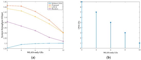 Figure 4a shows the system throughput for a variable number of WLAN-only UEs. We considered a scenario where the LTE network is crowded with LTE UEs, while the WLAN network is uncrowded. In this scenario, if we increase the number of WLAN-only UEs, we can see an increase in system throughput for the benchmark technology. This gain is contributed by the increase in utilization of the uncrowded WLAN system. However, this gain decreases as the number of WLAN UEs increases towards the saturation point of the system, as shown in Figure 4a. In the same figure, with LWA technologies, we considered offloading some of the LTE users to the WLAN. As discussed earlier in Section 3.3, the throughput gain in an LWA network constitutes the gain from the WLAN and LTE networks. The gain from the WLAN network is mainly due to utilization of the underloaded WLAN AP, whereas for the LTE network, it is from the remaining LTE UEs occupying more resources after offloading to the WLAN network. In other words, the per-user data rate of the remaining LTE users increases after offloading. However, as WLAN UEs increase, our algorithm limits the number of LTE users being offloaded to the WLAN, as shown in Figure 4b. Consequently, the system throughput gain achieved in both the WLAN and LTE networks decreases significantly. As a result, a decreasing trend in the overall throughput of the LWA network is observed.