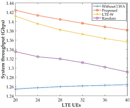 In this section, we present simulation results to validate the performance of the introduced LWA admission control algorithm in terms of system throughput. We use Matlab simulator in order to assess the network performance. The performance evaluation was conducted in an enterprise scenario of 200 m × 200 m, where there is an LTE small cell eNB located at the center and a WLAN AP within it. The LTE and WLAN UEs are distributed uniformly within the coverage area of the LTE network and WLAN network, respectively. We adopted the IEEE 802.11ax protocol with Request to Send/Clear to Send (RTS/CTS) access mechanism on 5 GHz in the simulations. Most simulation assumptions follow the 3GPP recommendations. A detailed description of the simulation parameters is given in Table 2. In the simulation, we considered the conventional LTE-only and WLAN-only technology as benchmark technology (without LWA), with system throughput representing the aggregated downlink throughput of LTE and WLAN networks. We also compared our results with random transfer and LTE-W []. A number of the random LTE UEs were selected for LWA activation in a random transfer. UEs were selected for activation of LWA service on LTE-W based on the lowest LTE throughput.