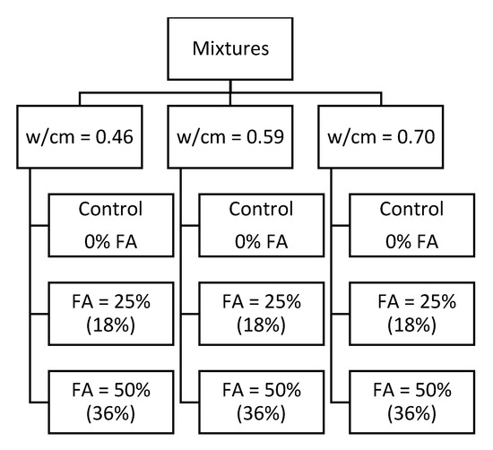 For this research, three different water/cementitious material (w/b) ratios were selected—0.46, 0.59, and 0.70—and three different contents of fly ash (FA)—0%, 25%, and 50%—in substitution by the weight of Portland cement, the mixtures selection considered the typical values in the concrete industry. After mixing, the curing process was performed in a wet chamber for 56 days, in order to increase the hydration of fly ash. Figure 1 shows a matrix of the mixtures that were used and Table 1 lists dosing from each of the used concretes, which has been adapted from Castro-Borges [23].