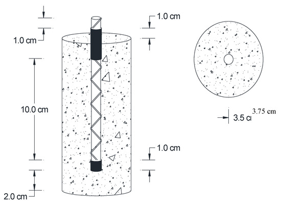 From each of the nine cement mixtures, we prepared three series of 75 mm × 150 mm test cylinders with 10 mm × 150 mm embedded steel (110 mm of exposure length) with a 33-mm-thick cover, as shown in Figure 2. The first series underwent CO2 degradation for the purpose of comparing the different mixtures under accelerated carbonation. The second series was exposed to chloride activity by the partial immersion of the samples in a solution of 0.5 M NaCl with water. Finally, the third series was exposed to various chloride percentages in the water for the mixtures (1%, 2%, and 4% of the mass of the cement material). The cement mixture process fulfilled the UNE-EN 12390-2: 2001 [26] standard, and previously pickled steel was used. For the chloride migration tests (NT BUILD 492 standard) [27], test cylinders 100 mm × 200 mm without steel embedded in them were built.