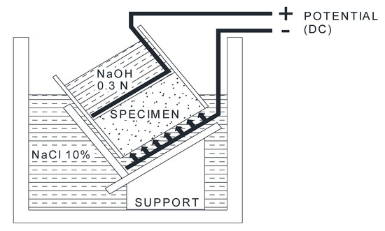 The corrosion potential (Ecorr) and the instantaneous corrosion current (icorr) were monitored and defined by the electrochemical method that is known as polarization resistance (Rp) [30] in a Princeton Applied Research model 362 EG&G potentiostat/galvanostat using a three-electrode configuration, with a saturated calomel electrode (SCE) as reference, a stainless-steel mesh electrode as the auxiliary electrode, and the reinforced steel as the working electrode. The Rp method was applied using a scanning rate of 0.5 mV/min and a perturbation of 10 mV from the anodic sense to 10 mV in the cathodic sense with regard to the Ecorr value of the working electrode. Figure 3 shows the three-electrode configuration that was used in the measurement.