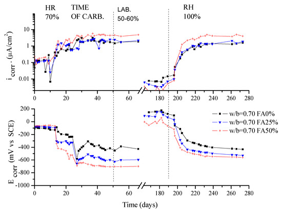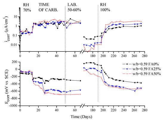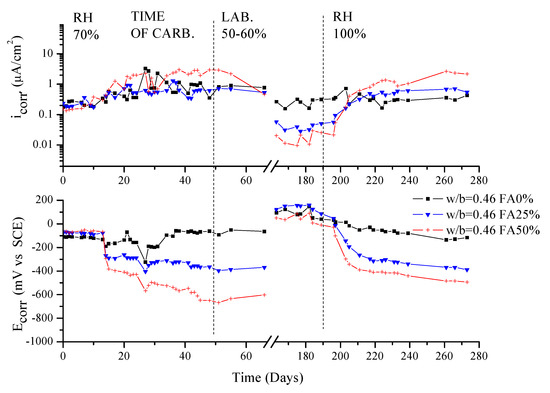 Figure 5, Figure 6 and Figure 7 show the evolution of the corrosion potential and the corrosion rate of the selected nine types of concrete for the accelerated carbonation study. During the first 50 days of conservation (first conservation stage) of these test cylinders, they were exposed to an atmosphere of 100% CO2 and between 60% and 70% RH. During this conservation stage, a slightly greater corrosion rate for the steels from mixtures with 50% FA substitution was detected. On the other hand, steels with 25% FA substitution showed corrosion values that were very similar to those of the steels with control mixtures (0% FA), behavior that was detected for all the w/b ratios. After this first conservation stage of 50 days in the carbonation chamber, it started a second stage where the samples were dried at ambient temperature (20–25 °C) with 50% and 60% RH for 140 days (from day 50 to day 190), were, despite the fact that during the first 17 days of this period of time (between day 50 and 67 of exposure), the test cylinders maintained the same behavior as in the first stage, a decrease on the corrosion levels in general is noted from day 162. The reason for this decrease is essentially because of the resistivity of the cement matrix, which prevails in such conditions. For the final stage of the research (from day 190 to day 275), the samples were stored in a desiccator and maintained at 100% RH. The greater the substitution content of FA, the greater the corrosion rates detected for w/b ratios of 0.46 and 0.59. However, at the w/b = 0.70 ratio, the performance of the steel with the 25% FA substitution was similar to that of the steel with the control mixture. This was unexpected behavior because the substitution of fly ash uses calcium hydroxide for its hydration, leading to the conclusion that the greater the substitution content of FA, the greater the pH drop. Although the matrix is denser with FA, this densification in some cases is not enough to compensate for the loss of alkalinity as a consequence of the hydration of FA. It is worth mentioning that in previous studies [16,17,31], a low alkaline reserve only affected the time during which degradation occurred when porosity was high; if low porosities prevailed, then with a minimum alkaline reserve, it was possible to protect the reinforcing steel during the initial phase.