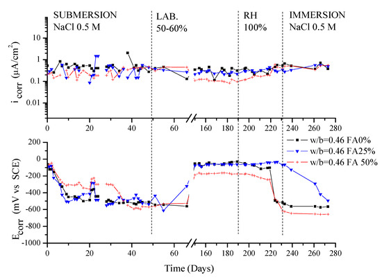 Figure 8, Figure 9 and Figure 10 show the evolution curves of the corrosion current density and the corrosion potential of steels embedded in the selected nine types of concrete that were exposed to degradation by external chlorides by immersion in water with 0.5 M NaCl. Figure 8 shows samples that were produced with w/b ratio = 0.46 and different FA contents (0%, 25%, and 50%), as is shown in Table 2. The figure shows that the corrosion rates were very similar between the three steels. This is related to the low w/b ratios, which prevent the degrading agent from entering. To detect the contribution of FA, greater exposure times are needed to define behavior and performance.
