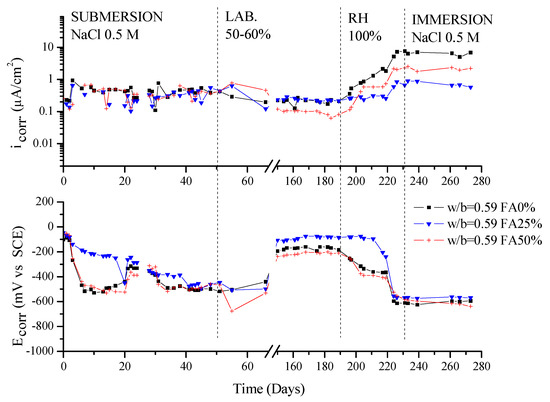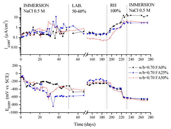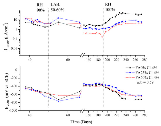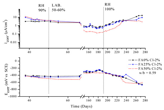 The results of the w/b = 0.59 and w/b = 0.70 ratios for the same FA substitution content are shown in Figure 9 and Figure 10. The steels have corrosion rates very similar to those of the first two stages. However, after day 200, the corrosion rates started to differ between the three steels. After day 200 for the w/b = 0.56 ratio (Figure 9), the mixture with 25% FA had a lower corrosion rate, whereas the steel with the mixture without FA added showed the highest corrosion rate. The steel with a mixture of 50% FA maintained an average corrosion rate as compared to the other two. For the w/b = 0.7 ratio (Figure 10) for the same period of time (after day 200), the corrosion rates of the steels embedded in mixtures with 25% and 50% FA had similar values, whereas the steel that was embedded in the control mixture showed an increase in the corrosion rate that was clearly greater than the other two. This behavior, where in general the greater the content of FA, the greater the protection of concrete against exposure of chloride ions, is mainly owing to the pozzolanic reaction, which increases the intricate matrix and reduces chloride diffusion. FA usually has a higher content of aluminates than Portland cement (24.65% Al2O3 for the FA in this study). As a result, the chlorides that try to penetrate the matrix bonded with the aluminates, thus forming Friedel’s salt [32,33]. However, obtaining lower corrosion rates for steel with the substitution of 25% FA at the w/b = 0.56 rate and similar rates for steels with substitutions of 25% and 50% FA at the w/b = 0.70 ratio, defined that an increase in the substitution of FA does not clearly lead to a more intricate matrix, because the lack of calcium hydroxide [Ca(OH)2] prevents the pozzolanic reaction from occurring.