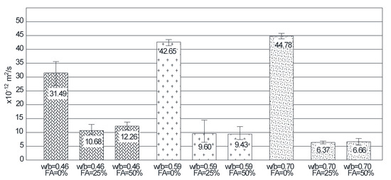 Figure 14 shows the values of the migration coefficients of chlorides, according to Standard NT Build 492, where the addition of FA improved, although at the same level of magnitude, the resistance against chloride migration. However, this improvement was limited, as shown by the very similar coefficients for 25% and 50% FA. These results coincide with the results of the corrosion rates in steels that were exposed to a 0.5 M NaCl solution and with the addition of chloride ions in the water for mixture, which also showed good performance of the mixtures with the substitution of FA.