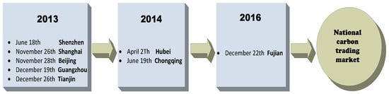 Energy structure adjustment, the development of energy conservation, and emission reduction have all become an important part of sustainable development strategy in China. In order to achieve effective control of total carbon emissions and guide enterprises to actively participate in emission reduction work, China’s carbon trading market has developed rapidly. Since October 2011, China has successively established trials of carbon emissions trading in seven provinces and cities, including Shenzhen and Shanghai, as shown in