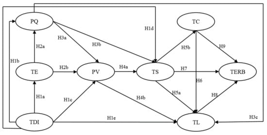 Among the eighteen hypotheses, twelve hypotheses’ paths are retained in the theoretical model (see Table 5). In Table 5, it can be found that, TDI significantly and positively influences TE (H1a) (β = 0.754 ***, t = 8.097, p < 0.01) and TL (H1e) (β = 0.152 ***, t =3.675, p < 0.01), which means that the parameter estimates of the paths are significant. H1a and H1e are supported. TE significantly and negatively influences PQ (H2a) (β = −0.743 ***, t = −4.003, p < 0.01) and PV (H2b) (β = −0.372 **, t = −2.829, p < 0.05). H2a and H2b are supported. PQ significantly and positively influences PV (H3a) (β = 0.606 ***, t = 5.252, p < 0.01) and TS (H3b) (β = 0.209 ***, t =3.684, p < 0.05). H3a and H3b are supported. PV positively and significantly influences TS (H4a) (β = 0.693 ***, t = 5.310, p < 0.01). H4a is supported. TS positively and significantly influences TL (H5a) (β = 0.899 ***, t = 5.577, p < 0.01) and negatively and significantly influences TC (H5b) (β = −0.140 **, t = −2.887, p < 0.05). H5a and H5b are supported. TC negatively and significantly influences TL (H6) (β = −0.150**, t = −2.919, p < 0.05). H6 is supported. TL positively and significantly influences TERB (H8) (β = 0.276 ***, t = 4.020, p < 0.05). H8 is supported. TC negatively and significantly influences TERB (H9) (β = −0.349 ***, t = −4.109, p < 0.01). H9 is supported. The outcomes are shown in Figure 3.