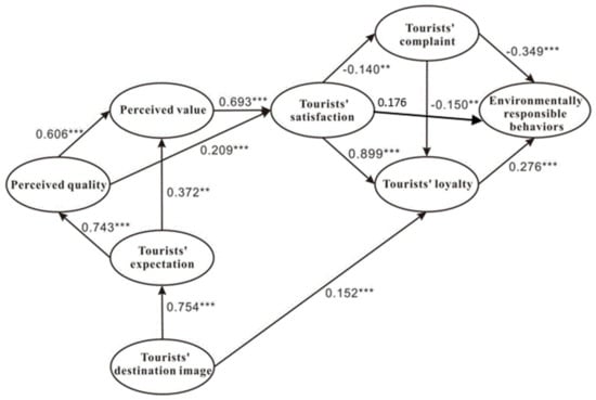 Based on the above results, the study also points to several practical implications for tourism destination to guide and cultivate TERB. First, the results suggest that TDI affects TERB through tourist emotional reflections, and it is a premise of tourist expectation, as suggested by [], and can influence tourist decisions to travel. Hence, the marking and management agencies at destinations should pay better attention in shaping TDI, and advertise it via mass media and the internet. Moreover, the destinations should be kept clean and tidy, and the landscape of the tourism destination should be planned and designed elaborately to give tourists a visual enjoyment and stimulate TERB. Second, tourist expectation, perceived quality, and value all influence TERB through tourist emotional reflections. However, among them, tourist expectation negatively affects TERB, because tourist expectation has not been met. Hence, the quality and cost effects of tourism products and services at the destination should be guaranteed and improved to meet the needs of tourists, with a view to enhance their ERB. In fact, tourist behavior is based on their interests met, and in TERB guiding and cultivation the management agencies of tourism destinations should do their best to provide enough products and services as well as facilities, such as the provision of food, accommodation, vehicles, shopping, entertainment, accurate travel routes, toilets, lounges and signboards for tourists. By doing so, tourist expectation before travel will be met, and then perceived value of tourism products and services will increase, and they will think this tourism experience is worthy of their expended money, time, and energy. Compared to other tourism experiences, they will think this one is much better. Based on this, the degree of tourist loyalty and satisfaction will grow, and subsequently tourist complaints will reduce, and this will in turn promote ERB, so that tourists will comply with the rules and regulations of destination willingly, not walking on the lawn, not throwing trash on the ground or into a pool or river, not painting or scratching historic and cultural buildings, not wrecking or climbing trees, and not capturing and killing rare animals. Finally, tourism destinations should be equipped with corresponding feedback facilities, such as free phone booths and suggestion boxes for tourist complaints, to help managers and organizers of destinations know about and deal with tourist troubles, reducing tourist negative emotional reflections and unfriendly behaviors to the tourism environment, and helping realize the sustainable development of tourism.