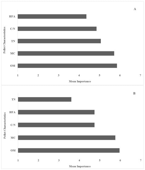 The importance attributed by farmers and advisors to each chemical characteristic of pellets is reported in Figure 1A,B, respectively. As it can be seen, the OM was the most important characteristic for both farmers and advisors.