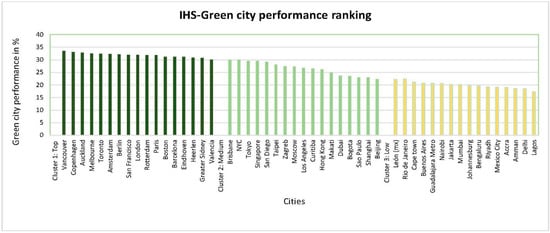 Despite these difficulties, the results obtained with the application of the IHS-GGCPI index method to some extent match with results found in the existing literature. Cities such as Vancouver, Copenhagen, London, Auckland, Amsterdam, Berlin, Toronto, Paris, and Barcelona found to be in the top Clusters 1 and 2 of the IHS ranking are also very often present in the top list of indexes which rank cities according to their sustainability, environmental performances and liveability [23,24,25,26,27,29,30,31,32].