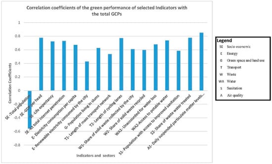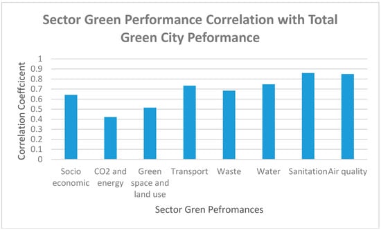 As can be seen in Figure 3, Sanitation, Air Quality, Water and Transport are the sectors presenting the strongest correlation coefficients with the total GCPs. Sanitation and Air Quality are the two sectors with the highest correlation coefficients with total green city performances, 0.71 and 0.70 respectively. Since the Air Quality sector has only one indicator (PM10) this indicator alone predicts 70% of the total GCP.