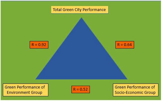 As shown in Figure 6, total green city performance is positively and significantly correlated with green performance in the environmental and socio-economic groups, and there is also a significant correlation between the green performance of the environmental and socio-economic groups.