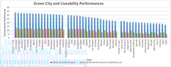 A strong positive and significant correlation was found between total green city performance and liveable city performance (r = 0.90). In Figure 2 and Figure 7, we can see that six out of the ten top green cities are also found among the ten most liveable cities, and eight of the ten cities with the lowest GCPs are also found among the ten cities with the lowest liveability performances.