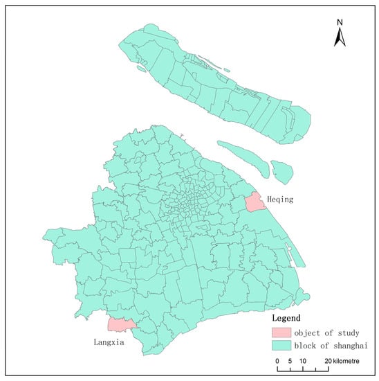 Two approved municipal land consolidation projects in China were selected for empirical analysis: one located in Heqing Town, Pudong New Area, and the other located in Langxia Town, Jinshan District, Shanghai (Figure 1). The former is located in an inner suburb of Shanghai with a project scale of 72.58 hectares and a total investment of approximately 128 million RMB. The project was initiated in June 2013 and was completed in June 2014. The construction period was 12 months. It was a project characterized by low-efficiency construction land reclamation. The latter was located in an outer suburb of Shanghai with a project scale of 1771.22 hectares and a total investment of approximately 710 million RMB. There were 2846 rural households in the region with a total population of 11,920, and there was 1210.87 hectares of cultivated land. It was a project characterized by landscape ecological construction and high-standard farmland construction.