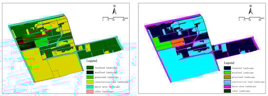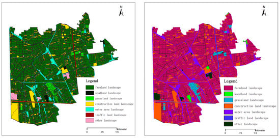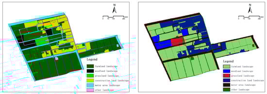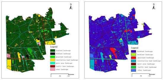 The data used in this article are land use type data of Heqing Town in the Pudong New Area and Langxia Town in the Jinshan District before and after land consolidation. First, the landscape types based on land use types were reclassified, which were divided into cultivated land, woodland, garden plot, construction land, water, traffic land and other. Second, all data into 4 m × 4 m grids with classification information in ArcGIS 10.2 were rasterized (Esri, CA, USA). Third, landscape index analysis was performed using Fragstats 4.2 (Copyright 2013 Kevin Mcgarigal & Eduard Ene). The results of the rasterization reclassification are shown in Figure 2, Figure 3, Figure 4 and Figure 5.