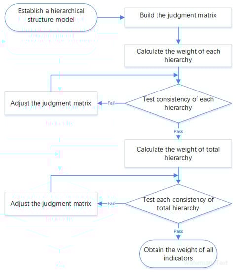 is the eigenvector of the judgment matrix , is the maximum eigenvalue of the matrix , and is the relative weight of the objects. The main steps are shown in Figure 6. The weights of the evaluation indicators are obtained in Table 3.