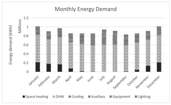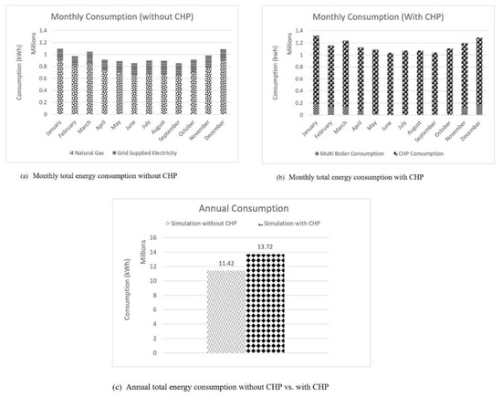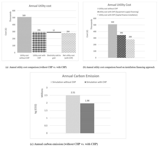 - Introduction of the CHP into the model to evaluate the possible maximum CHP size based on the hotel’s base heating load with priority to meet Domestic Hot Water (DHW) demand, which is substantial and consistent throughout the year, hence ensuring that all the heat produced by the CHP is utilised.