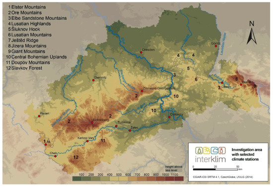The Ore Mountains (called Erzgebirge in Germany or Krušné hory in the Czech Republic) are the most important mountain chain separating both countries (#2 in Figure 2). For around 800 years, they have formed an administrative border between Saxony and Bohemia, and, after World War II, the border between Germany and the Czech Republic was established just north of the main crest of the mountain range. The average height is around 700 m a.s.l., while the highest peaks are Klínovec on the Czech side (1244 m a.s.l.) and Fichtelberg on the German side (1215 m a.s.l.). Since in higher elevations a large part of the precipitation falls as snow, long-lasting snow cover forms during the winter usually lasting until April. Hence, a well-developed winter tourism region has evolved in the region [38,39].