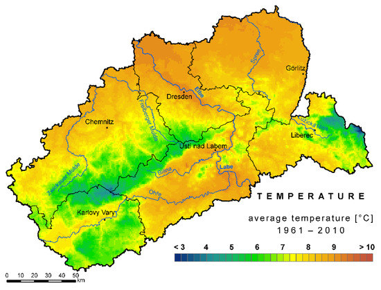 The study area is determined by a gradual shift from the maritime western European climate towards the more continental climate of Eastern Europe. The balancing effect of the Gulf Stream strongly impacts the region, resulting in higher average temperatures (1961–2010 area mean: 7.8 °C; Figure 3 for spatial details) and lower seasonal changes than in regions of similar geographical latitudes in northern America, eastern Europe and northern Asia [15,28]. However, the apparent continental influence results in comparably low precipitation amounts (1961–2010 area mean: 740 mm; Figure 4 for spatial details), despite the hilly character of the study area. The spatial distribution of precipitation is modulated by windward/leeward effects. The largest precipitation amounts are registered in the Ore Mountains and the western Sudetes (Jizera and Giant Mountains) in the east with up to 1600 mm/year. In contrast, the Lowlands of Bohemia in the central southern part of the study area—prone to leeward effects of the mountains in their west and north—only receive between 400 and 500 mm/year. The lowlands in Saxony in the northern part of the study area benefit from a comparably high frequency of moist air masses approaching from north and northwest, leading to larger precipitation amounts than in their southern counterparts.