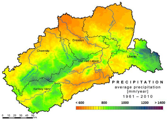 Annual precipitation average in the study region in 1961–2010; adapted from LfULG 2014 [44].