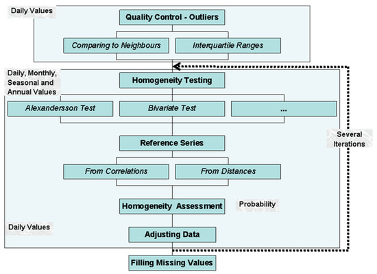 The original time series covering the full period 1961–2010 were available for some stations only. Most stations include a certain degree of gaps for one or a period of days or months or sometimes even longer periods. Thus, the following approach was applied to establish time series without missing values at all stations. It consists of three major steps: quality assurance, homogenization and gap filling. The entire process was developed and described in detail by Štěpánek et al. [45,46,47]; it was carried out using the ProClimDB software package [48] and is summarized in Figure 5.