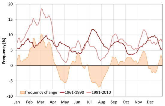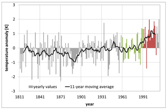 The seasonal temperature cycle of the study region is characterized by lowest temperatures in January and highest in July [15]. Annual temperature variations of the city of Dresden (Saxony) in the past 200 years are displayed based on [28] in Figure 6—those variations are typical for lower elevations in the study area. Variations are shown as an anomaly to the period 1961–1990, which corresponds almost exactly to the mean of the complete 20th century. The first period used in this publication (1961–1990) therefore includes temperature conditions characteristic of the 20th century. A considerably higher temperature level dominates since 1988, so the second time slice (1991–2010) used in this paper represents the recent remarkable temperature increase.