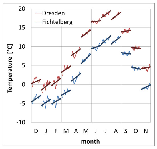Figure 7 shows the monthly low-pass-filtered time series and trends between 1961 and 2010 of one lowland station (Dresden) and the mountain station Fichtelberg in the Ore Mountains (1213 m; at the Saxon–Czech border). A similar temporal variability is visible between time series of both stations in most months, with few exceptions. Similarly, the trend magnitude and direction generally harmonize between both stations, but different magnitudes (e.g., June and December) and even directions (September) sometimes appear. The annual warming trend between 1961 and 2010, apparent in the study area, is mainly caused by increasing temperatures between January and August, while none or only weak warming signals are present in the last third of the year (Figure 7). The most pronounced warming took place in the middle of January and the end of April, comparing 1991–2010 with 1961–1990 (not shown).