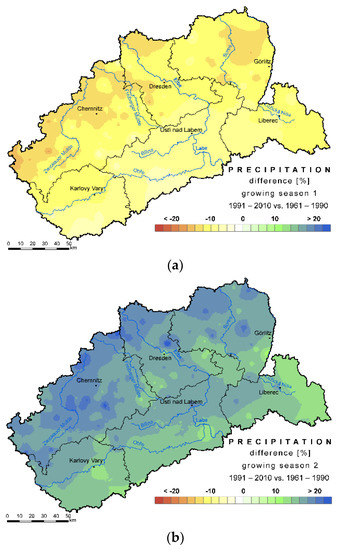 Change signal (1991–2010 vs. 1961–1990) of precipitation amounts in the two growing seasons: (a) early growing season (April to June); and (b) late growing season (July to September); adapted from LfULG 2014 [44].
