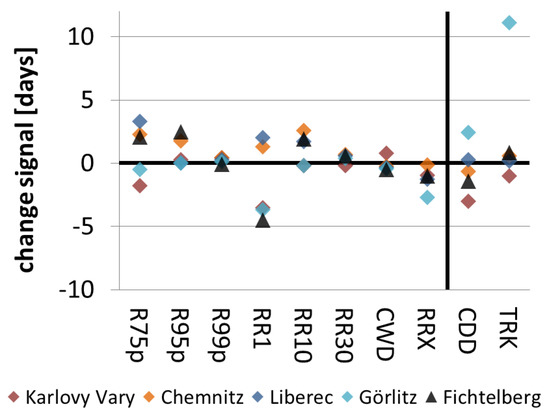 Figure 8 shows change signals of temperature indices (defined in Table 1) for five meteorological stations (for their location, see Figure 2) located in the four corners of the study area. Both warm (increasing frequency) and cold extremes (decreasing frequency) indicate warming. Much larger signals for warm (TN90p and TX90p—about 20 days increase) than cold percentile-based indices (TN10p and TX10p—about five days decrease) indicate a stronger warming effect on warm than cold extremes. A stronger decrease of cold and a weaker increase of warm extremes at Fichtelberg, compared to the other stations, represent the generally colder conditions prevailing at higher altitudes.