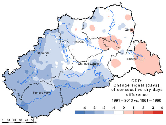Change signals for periods with distinctive precipitation deficits exhibit a pronounced slope from west to east. Analogous to annual precipitation increases, long dry periods (CDD, Figure 11) occurred less often in the western and central parts of the study area. Nonetheless, they remained constant or occurred slightly more often in the east (despite the observed precipitation increase). The intensification of drought periods (TRK) in Görlitz in the north-eastern part of the study area is particularly striking (Figure 10). Here, TRK increased by 11 days in their annual mean in 1991–2010 compared to 1961–1990. This rise mainly took place in the growing season with the largest increase in April (from a mean of four to eight days) as well as in August and September. While the April increase is consistent with decreasing precipitation amounts and was similarly observed in the rest of the project area, the increase in August and September occurred despite higher precipitation amounts (which, in turn, resulted from increasing heavy precipitation events).