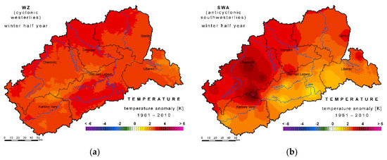 Spatial distribution of temperature anomalies (in K) during the winter half year for: (a) WZ (cyclonic westerlies); and (b) SWA (anticyclonic south-westerlies); adapted from LfULG 2014 [44].