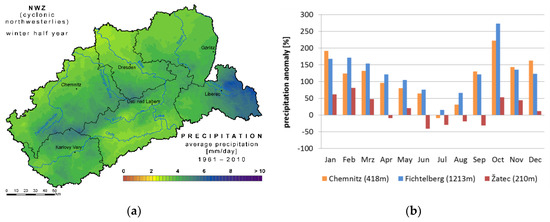(a) Spatial distribution of precipitation anomalies (in percentage) during the winter half year; and (b) seasonal cycle of average precipitation anomalies (in percentage; from 1961–2010) for NWZ (cyclonic north-westerlies); adapted from LfULG 2014 [44].