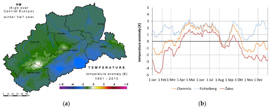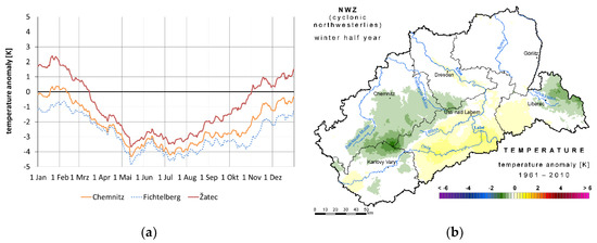 (a) Spatial distribution of temperature anomalies (in K) during the winter half year; and (b) seasonal cycle of average air temperature anomalies (in K; from 1961–2010) for NWZ (cyclonic north-westerlies); adapted from LfULG 2014 [44].
