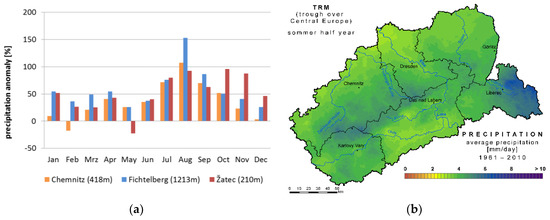 (a) Seasonal cycle of average precipitation anomalies (in percentage from 1961–2010); and (b) spatial distribution of precipitation anomalies (in percentage) during the summer half year for TRM (trough over Central Europe); adapted from LfULG 2014 [44].