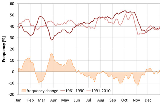 The study region is determined by fluctuations of maritime Atlantic and continental air masses approaching from northern, eastern or southern directions. The most frequent weather types are marked by grey background colour in Table 3. The Atlantic impact is distinctively stronger during the winter half year than the summer half year. Atlantic air mass inflow from the southwest, west and northwest—responsible for a variable weather character—dominates, on average, every second day during the winter half year, compared to every third day during the summer half year. During the latter, local and regional convection plays an important role, while synoptic-scale circulation—largely steered by the fluctuations of Icelandic Low and Azores High—is most important during the winter half year. Section 4.1 evaluates the character of weather types important for the climate of the study area, while Section 4.2 relates their frequency changes to climate fluctuations observed in the study region.