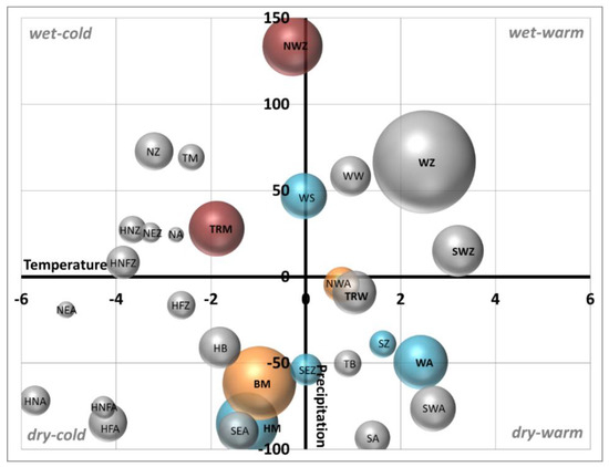 The character and frequency of large-scale weather types are important for analysing long-term climate fluctuations in the study region, on top of global processes such as increasing climate-relevant tropospheric greenhouse gas emissions and concentrations. In addition to shorter periods such as weeks or seasons, also longer-term climatic changes of averages, variability and extremes are quite well explained by frequency fluctuations of certain weather types, if their regional peculiarities are known. Hence, detailed maps of temperature and precipitation anomalies of all 29 weather types (Section 2.4) have been created. They help to describe the influence of atmospheric circulation within the study area, and how it affected recent climatic changes (such as the precipitation decline in growing season 1 and increase in growing season 2) illustrated in the previous section.