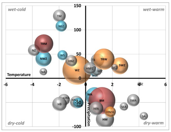 Cyclonic westerly (WZ): The most common weather type is characterized by intensive cyclonal activity, impacting the study area by frequently passing weather fronts. Related to frequency and moisture content, WZ is an important supplier of precipitation. However, extreme precipitation events occur rather seldom compared to its frequency, since the weather fronts usually pass the study region quickly from west to east. The regional precipitation distribution is similar between seasons with the highest values in the mountains and lowest in the Bohemian Basin. Comparably warm temperatures dominate during the winter half year, and cold ones during the summer half year. The positive wintery thermal anomaly is more visible in the lowlands than in mountainous areas, associated with rarely observed temperature inversions (characterized by cooler temperatures in the lowlands than in the mountains) and windward-effects (cooling) in the mountains (Figure 12a).