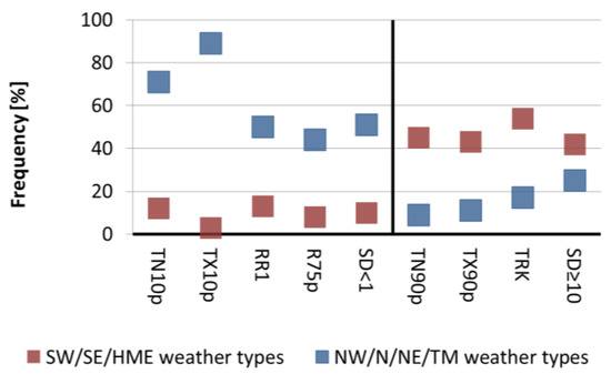 “Grosswetterlagen” (weather types) define atmospheric processes grouped into weather types including days with similar characteristics lasting from at least three days up to several weeks. They are determined by: (1) similar geographical distributions and spatial movements of steering pressure areas, i.e., anticyclones and cyclones, troughs and ridges; (2) comparable directions of air mass inflow; and (3) similar attributes of air masses. The Grosswetterlagen classification employs 29 Grosswetterlagen, which may be combined to more general types, e.g., ten “Grosswettertypen” (major types; see Table 3 and Werner and Gerstengarbe 2010). In [20], a comprehensive discussion about: (a) the historical development of the Grosswetterlagen classification; (b) occurrence, frequency variability and trends of circulation types; and (c) relations to sea level pressure, temperature and precipitation in the North Atlantic-European area can be found.
