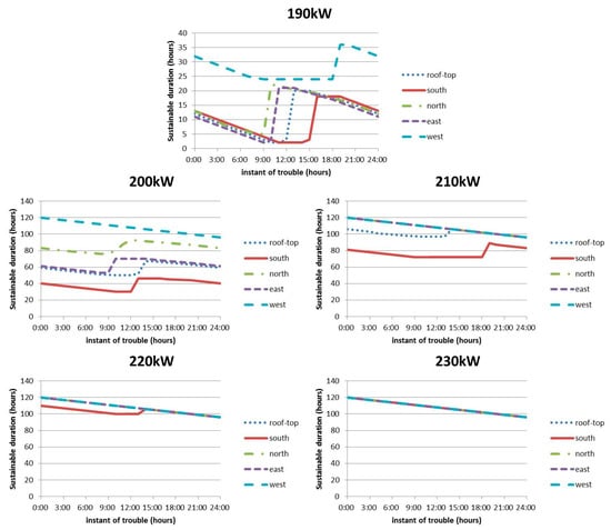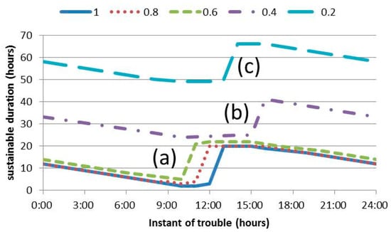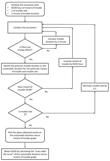 - If there is no energy deficit, the simulation is repeated with increasing trouble duration in steps of 1 min until the energy deficit is obtained. Once the energy deficit is obtained, the previous trouble duration is recorded as the sustainable duration for the particular instant of trouble and trouble rate.