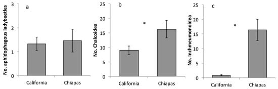 Differences in abundance (mean ± standard Error) for aphidophagous ladybeetles (a), Chalcidoidea parasitoids (b), and (c) Ichneumonoidea parasitoids in urban gardens in the central coast of California (USA) and in in the Chiapas highlands (Mexico). Asterisks (*) indicate significant differences in mean abundance in the two different locations as determined with t-tests (see text for details).