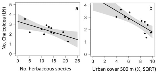 In California, the model that best predicted Chalcidoidea abundance was an average of eight top models that included garden age, garden size, mulch and herbaceous cover, and urban cover within 500 m; however, no factor significantly predicted Chalcidoidea abundance. In Chiapas, the model that best predicted Chalcidoidea abundance was the average of three top models and included two local factors and one landscape factor. Chalcidoidea abundance declined with the number of herbaceous plant species (p = 0.032, Figure 3a) and with urban cover in the surrounding landscape (p = 0.007, Figure 3b), but did not differ with changes in herbaceous cover (p = 0.089).