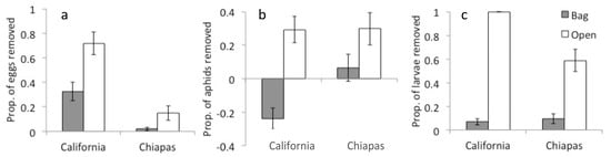 Natural enemies removed large proportions of prey items in both locations; on plants to which predators had access, they removed 15–72% of eggs (Figure 5a), nearly 30% of aphids (Figure 5b), and 58–100% of larvae (Figure 5c). According to the GLMM models, egg removal was higher in open compared with bagged treatments (t = 5.41, p < 0.001), and relative removal was higher in California than in Chiapas (t = 5.46, p < 0.001). Likewise, aphid removal was higher on open compared with bagged plants (t = 3.97, p < 0.001), but relative removal of eggs did not differ with location (t = 0.77, p = 0.446). Larvae removal was higher on open compared with bagged plants (z = 9.303, p < 0.001), and was higher in California than in Chiapas (z = 4.430, p < 0.001).