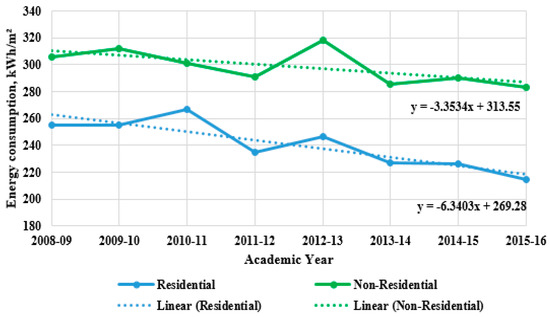 The higher education (HE) sector of the United Kingdom (UK) is comprised of 161 universities. Buildings in the HE sector consume electricity and gas and are responsible for scope 1 (electricity related emissions) and scope 2 emissions (fuel related emissions). In 2010, the HE funding councils (HEFCs, the UK) introduced a 43% carbon reduction target for the year 2020 compared to 2005/06 and linked the capital funding of universities to this target [1]. Since then, the universities in the UK have been implementing a range of carbon reduction projects, which mainly include energy efficiency measures and installation of renewable and clean technologies, such as solar, wind, biomass and Combined Heat and Power (CHP). Figure 1 presents energy consumption of the residential and non-residential buildings of the HE sector in different academic years in terms of kWh/m2.