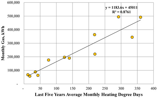 Figure 5 shows the relationship between the last five years average HDDs and the monthly gas consumption of the year 2011. A linear relationship is apparent, which clearly suggests that the larger the number of heating degree days, the higher the heating demand and gas consumption will be, and vice versa. The plot provides an equation with a slope and intercept, where “x” denotes the number of monthly HDDs. Using the HDD values for the year 2011, the gas consumption has been normalized. Figure 6 shows the comparison between the actual and normalized monthly gas consumption of McLaren House. The comparison suggests that in 2011, the gas consumption in January, February and November should have been less but was observed higher.
